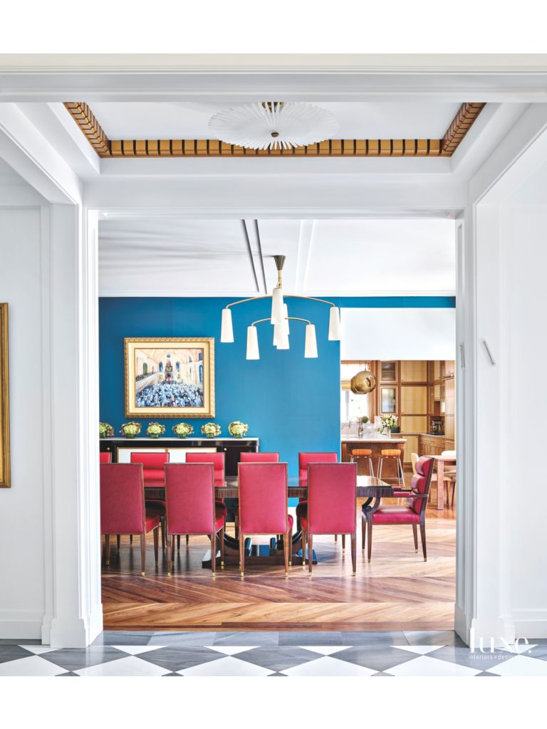 Blue Dining Room With Red Seating And Light Fixture Luxesource
