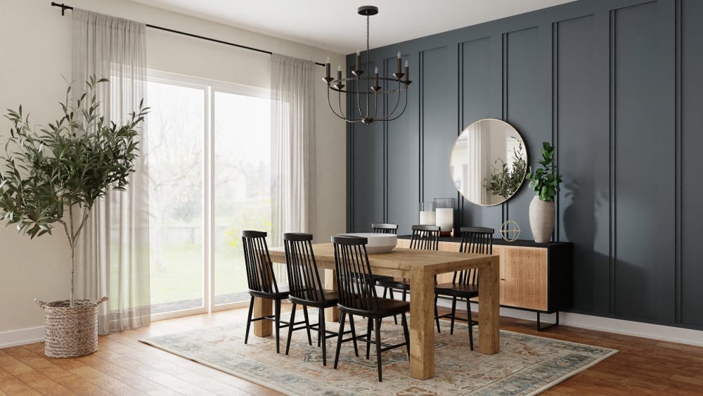 A Dining Room With Wood Table And Black And Wood Dining Chairs