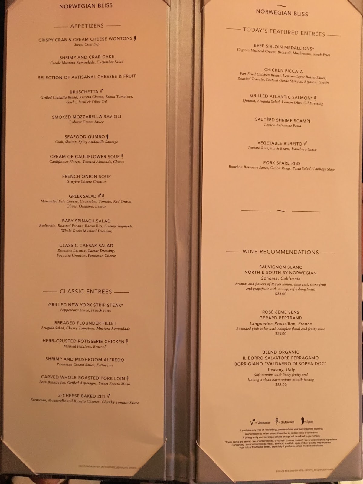 Norwegian Bliss Main Dining Room Menu