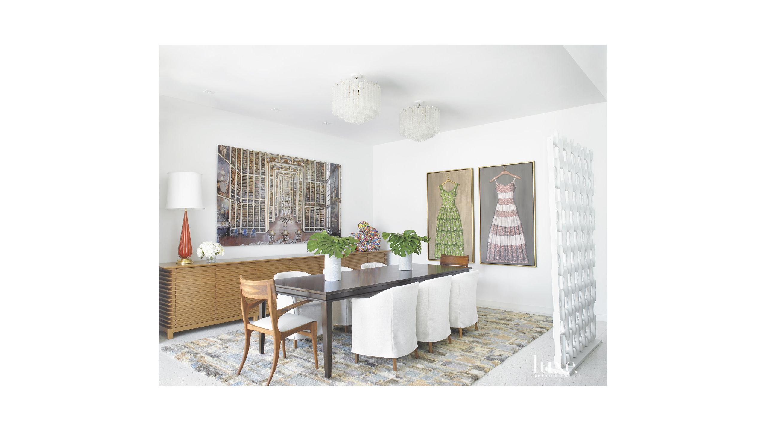 Eclectic White Dining Room With Shag Rug Luxe Interiors Design