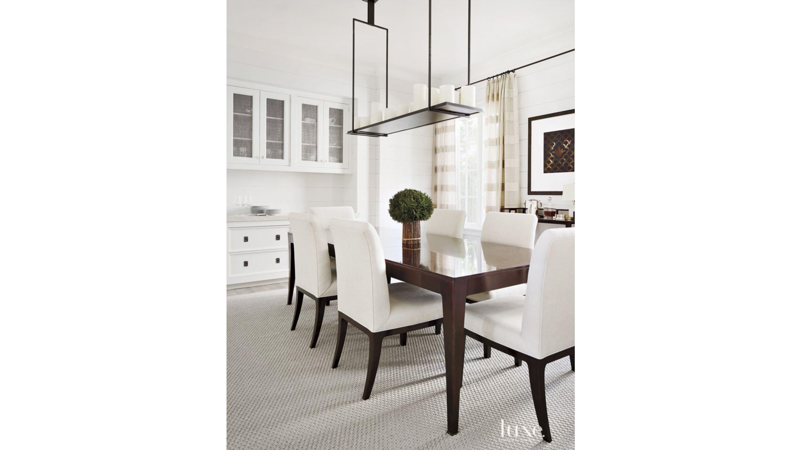 Transitional White Dining Room With Candle Light Fixture Luxe